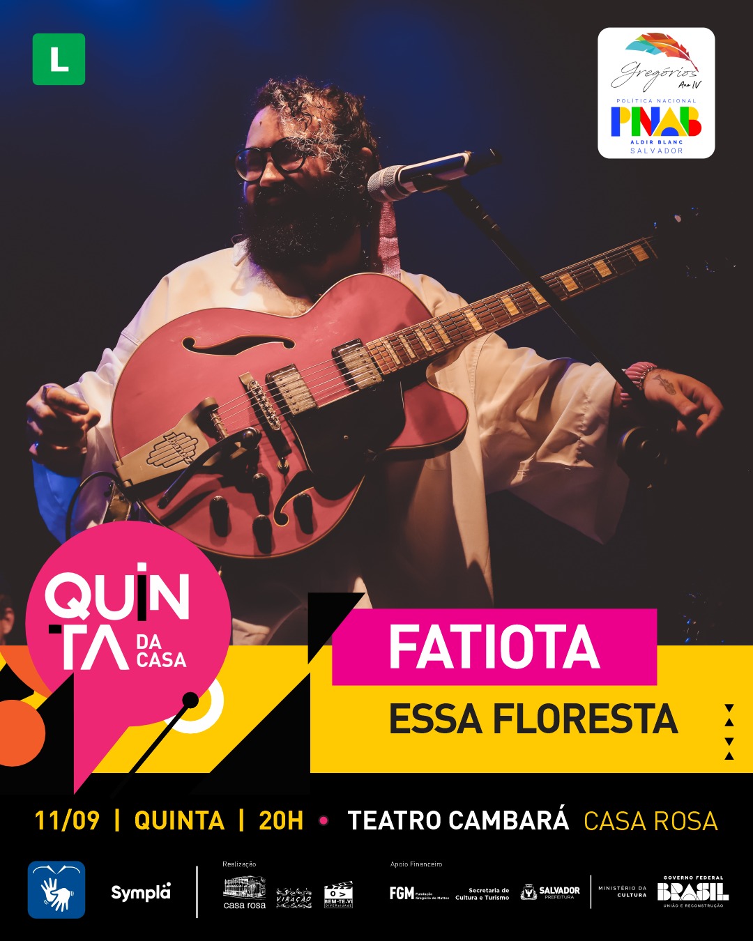 O projeto “Quinta da Casa” da Casa Rosa leva ao Teatro Cambará, no dia 11 de setembro, às 20h, o show “Essa Floresta”, de Fatiota. O artista propõe um espaço de troca, em que universos se misturam diante de um bosque desconhecido, onde paisagens-canções surgem, encontrando vida nova nas vozes e instrumentos de convidados especiais da cena soteropolitana. Ingressos custam R$ 30 (inteira) e R$ 15 (meia), à venda pela Sympla. O espaço tem acessibilidade arquitetônica e o evento terá tradução em Libras.